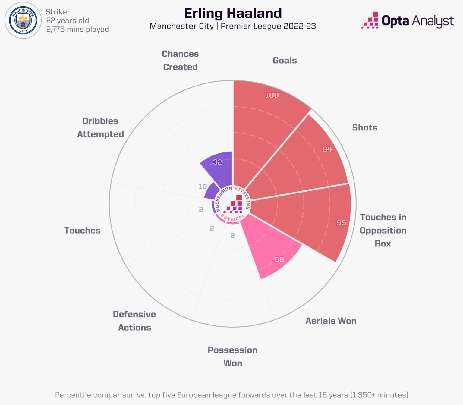 Хорошим прикладом для розуміння буде Холанд. Ерлінг у минулому сезоні забив більше голів, ніж 99% форвардів в попередні 15 сезонів, а бив по воротах частіше, ніж 94% інших форвардів. Водночас в історичному розрізі лише 2% нападників здійснювали менше захисних дій і рідше зустрічалися з м'ячем, ніж норвежець.