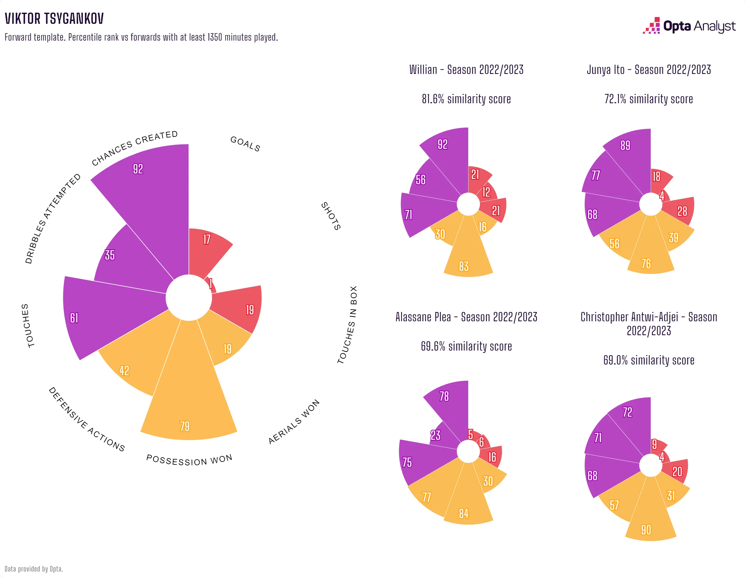 Найближчим до Циганкова у минулому сезоні був Вілліан (82% схожості), який непогано виглядав у Фулхемі. Подібні радари також мають Джюня Іто з Реймса, Алассан Плеа з Гладбаха та Крістоф Антві-Аджей з Бохума.