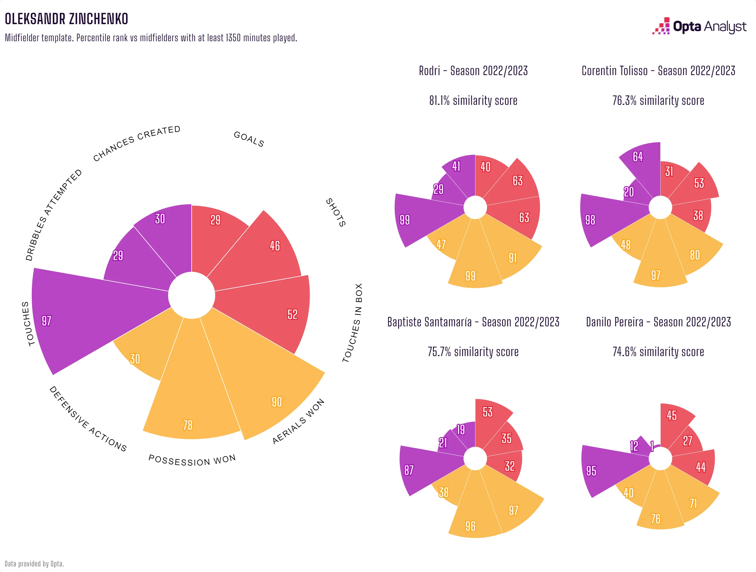 Система підібрала 4 футболістів, які в сезоні-2022/23 були найбільш схожими на Зінченка. Це Родрі, який забив переможний гол Манчестер Сіті у фіналі Ліги чемпіонів (81% схожості), Корентен Толіссо з Ліона, Баптіст Сантамарія з Ренна та Данілу Перейра з ПСЖ.