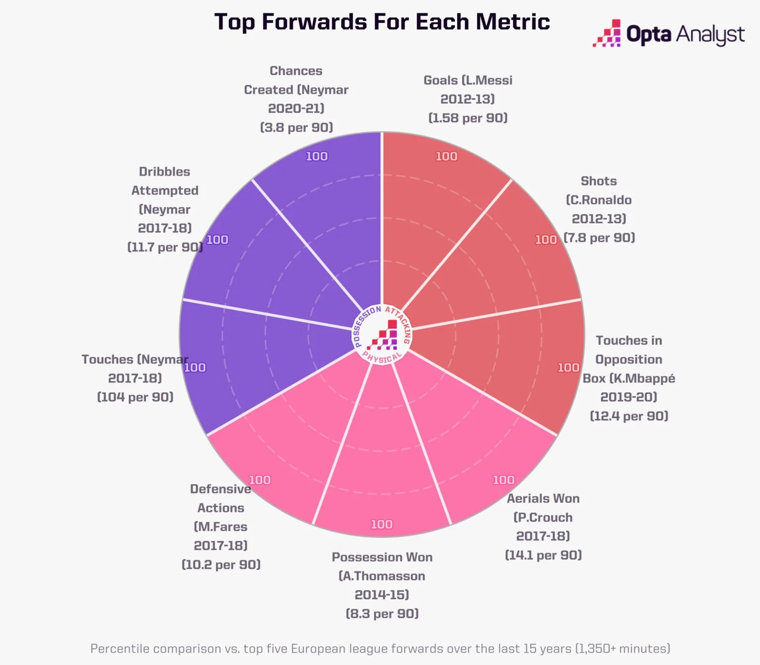 Opta пропонує порівняти футболістів з топ-5 ліг за допомогою радару. Радар для кожного гравця сформований на основі 9 ключових показників (всі розраховані на 90 хвилин).