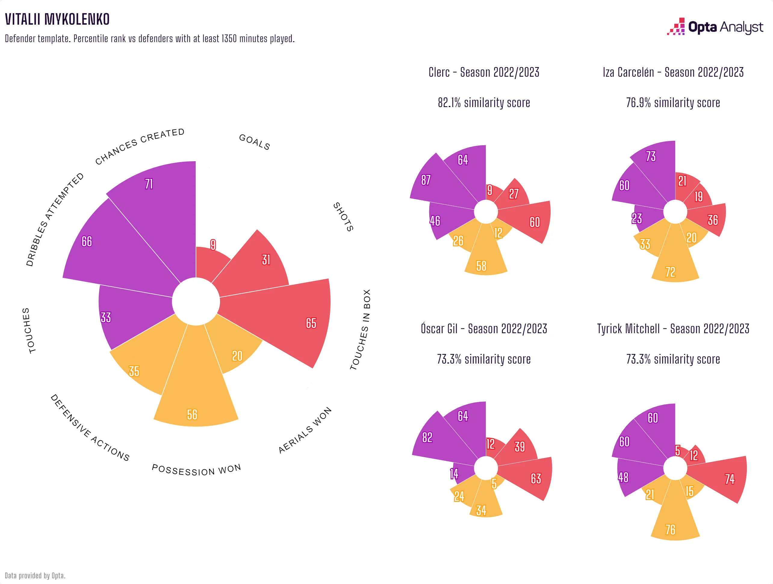 До уваги беруться лише ті футболісти, які в попередньому сезоні відіграли за команду понад 1350 хвилин у чемпіонаті, тобто 15 повних матчів. Тому для формування радарів Маліновського чи Мудрика мало даних. Натомість є статистика Миколенка.
