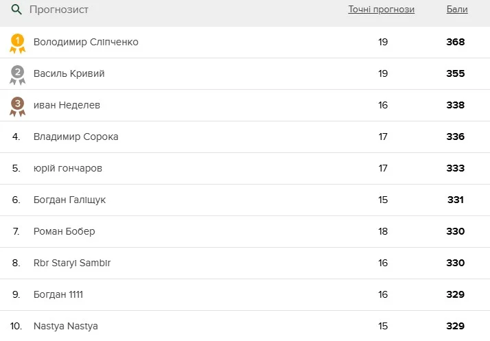 Чемпіоном попереднього тижня став Володимир Сліпченко із Берестина (колишній Красноград) Харківської області. Земляк зіркових Луніна та Мудрика набрав аж 368 очок. На другій сходинці – 355 балів – розташувався Василь Кривий із Теофіполя Хмельницької області. Замкнув трійку призерів Иван Неделев із обласного Миколаєва – 338 очок.