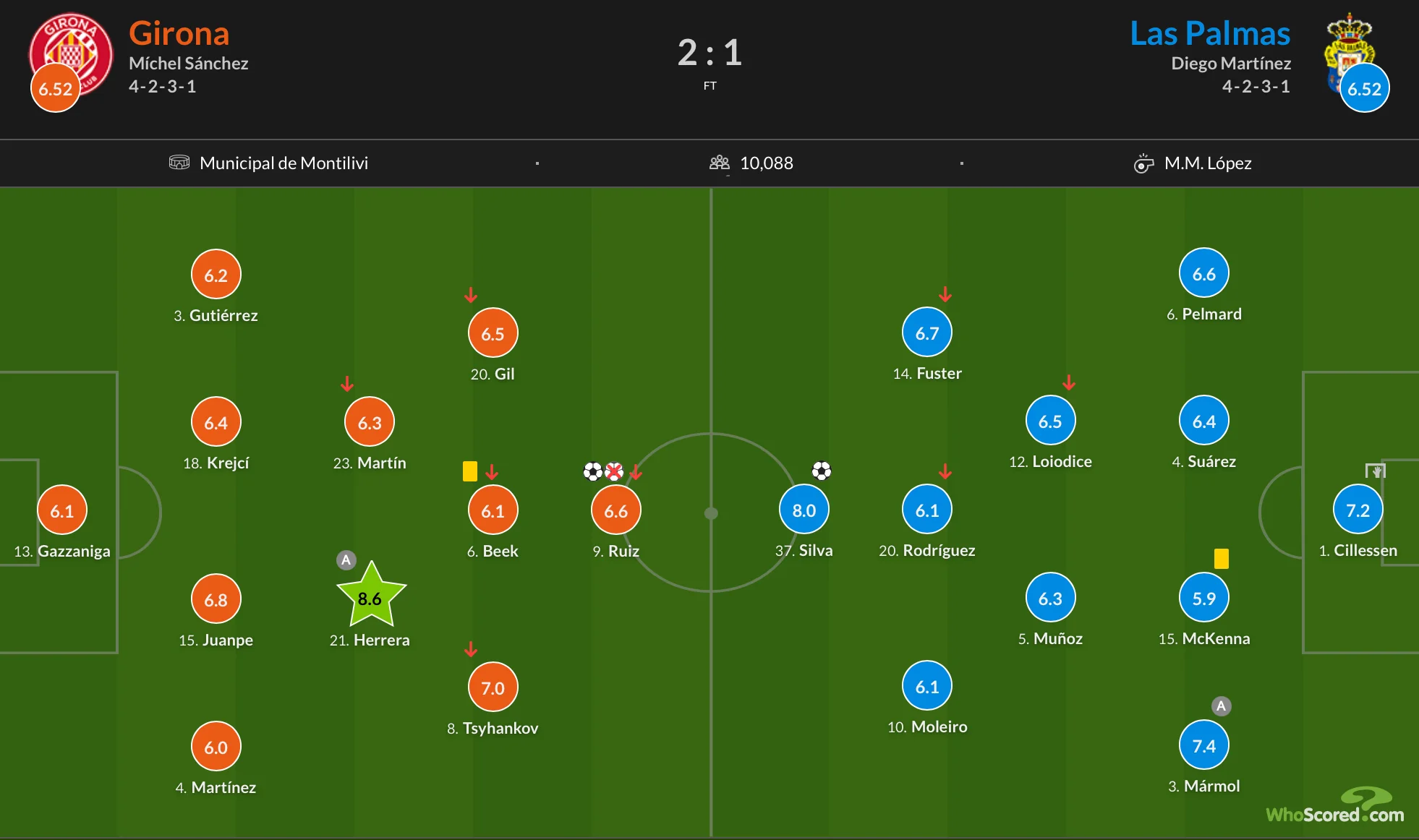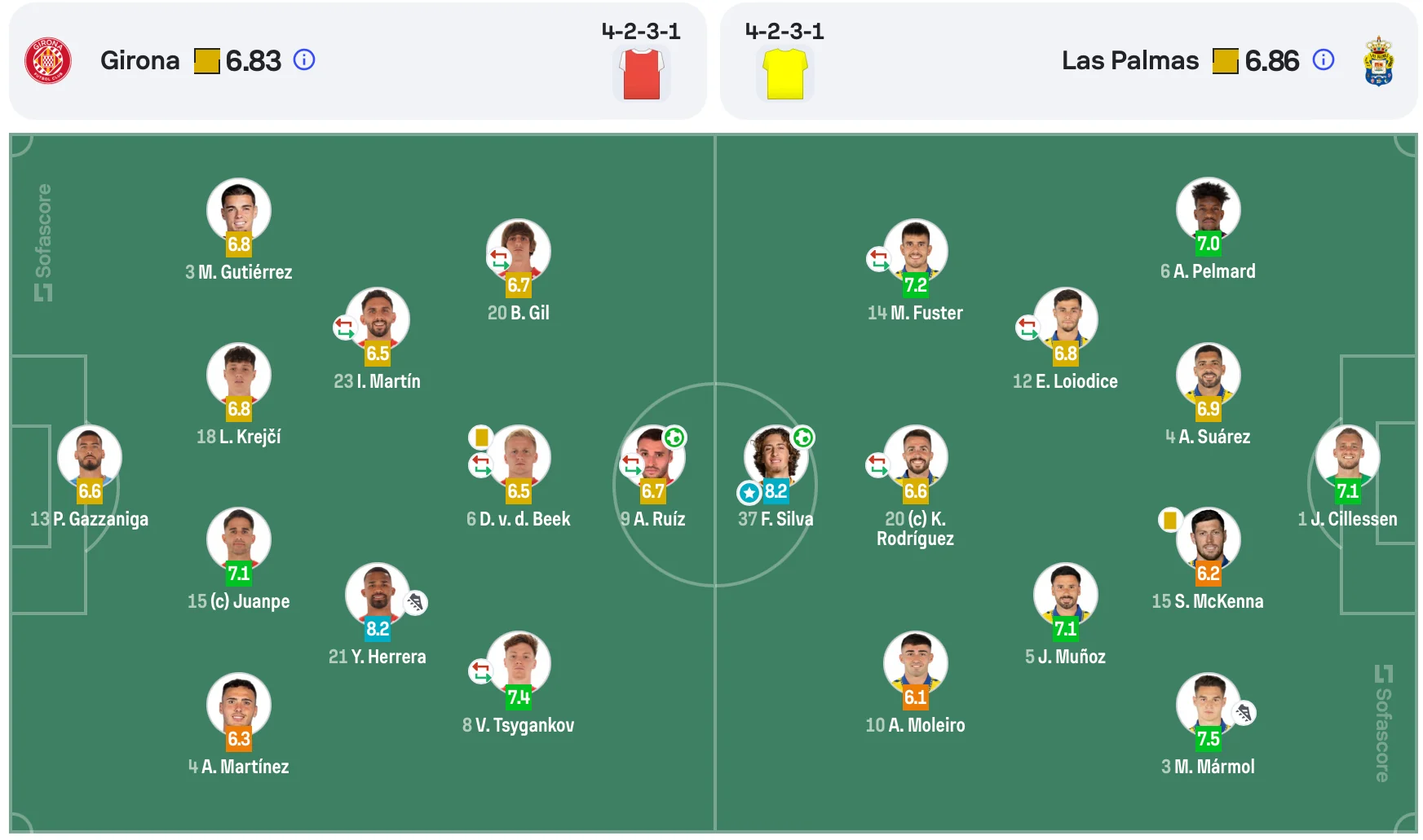 Віктор Циганков вийшов у стартовому складі каталонців і провів на полі 74 хвилини. За свою гру українець отримав 7,4 бала від SofaScore, тоді як WhoScored оцінив його виступ у 7,0. Від обох платформ це другий найкращий показник серед гравців стартового складу Жирони після Янхеля Еррери.