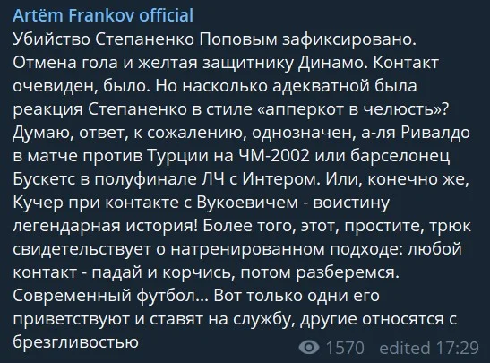 Головний редактор журналу "Футбол" Артем Франков, який відкрито вболіває за Динамо, визнає, що контакт між Поповим і Степаненком був, але зазначає неадекватну реакцію хавбека донеччан.