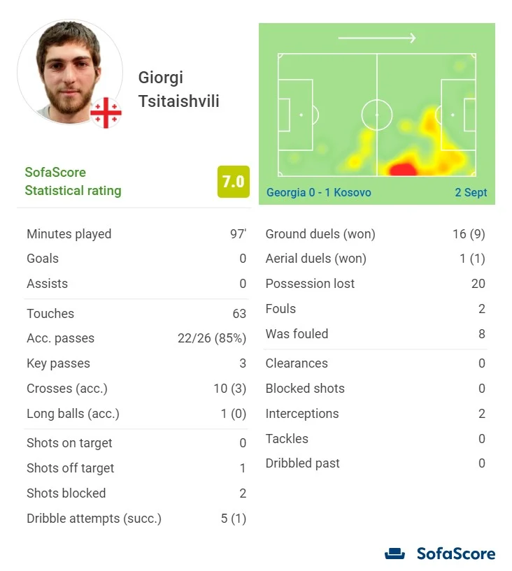 Георгій Цітаішвілі вирішив виступати за збірну Грузії і сьогодні отримав від Віллі Саньйоля перший шанс. Вихованець Динамо вийшов у стартовому складі на правому фланзі атаки. Цітаішвілі провів весь матч і був одним з найпомітніших у команді. Брав на себе ініціативу, сміливо йшов у обіграш, віддав три передачі під удар. Суперники грали проти нього досить жорстко і 8 (!) разів порушили правила. Низька точність кросів не дозволила Георгію розраховувати на дуже високий бал. Оцінка від SofaScore – 7.