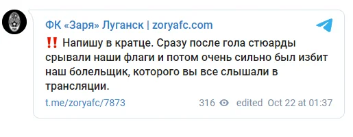 "Напишу коротко. Відразу після гола стюарди зривали наші прапори, а потім дуже сильно був побитий наш уболівальник, якого ви всі чули в трансляції", – йдеться в публікації Telegram-каналу вболівальників Зорі.