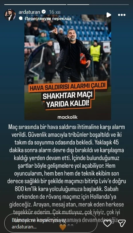Головний тренер Шахтаря Арда Туран розповів, що турецькі вболівальники почали хвилюватися за нього через повітряну тривогу.