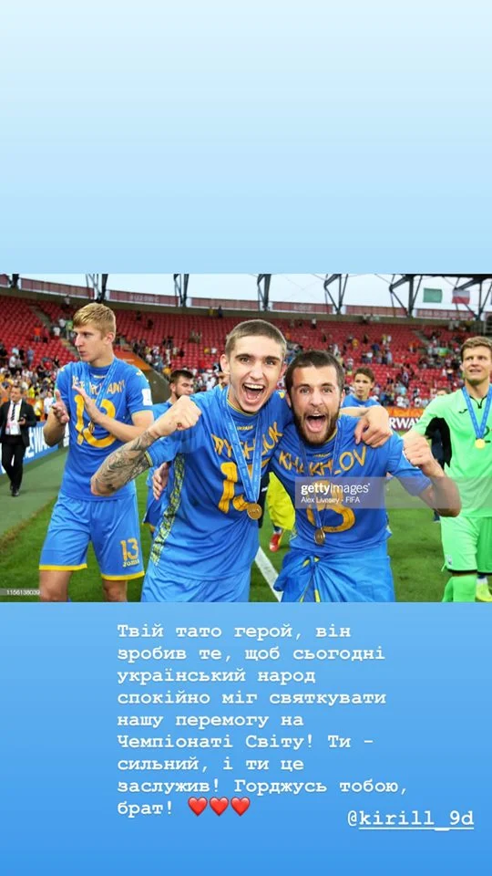 Півзахисник збірної України U-20 Олексій Хахльов звернувся до Кирила Дришлюка після перемоги на чемпіонаті світу-2019. Батько гравця загинув в АТО у 2014 році.