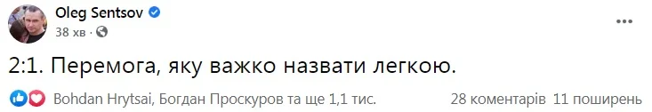 Режисер і колишній в'язень Путіна Олег Сенцов видихнув із полегшенням лише після фінального свистка.