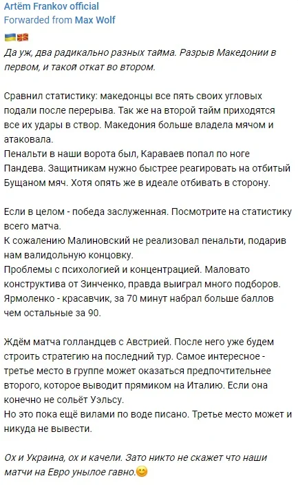 Вистояли! Вистраждали! Перервали 6-матчеву серію поразок у фінальних частинах чемпіонату Європи і тепер у нас хороші шанси на вихід в 1/8 фіналу. Але все могло скластися зовсім по-іншому. Якби у першому таймі забили втретє. Якби реалізували пенальті у таймі другому. Натомість до останніх секунд доля трьох очок висіла на волосині. Фу-у-х, видихаємо.