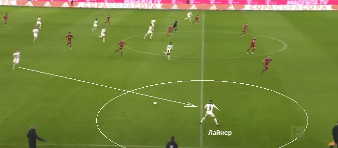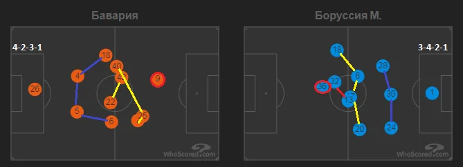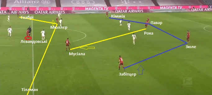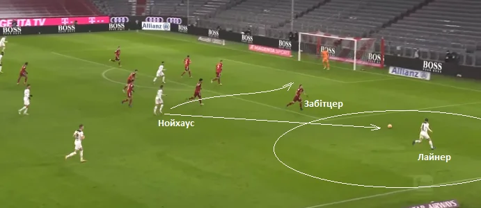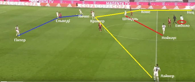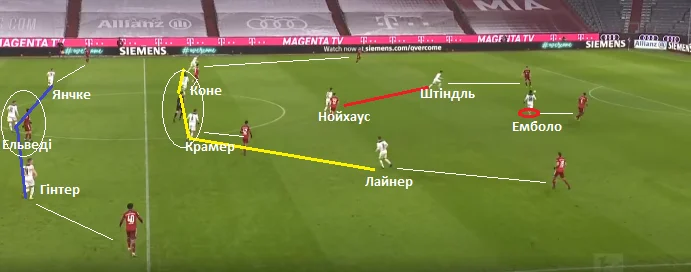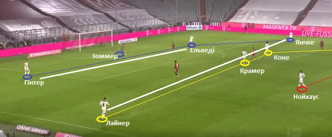 На скріншоті вище – структура пресингу команду Хюттера. Емболо і Штіндль тримали під контролем центрбеків Баварії. Нойхаус тримав одного з опорних, другий (Мусіала) систематично у конструктивній фазі зміщувався у лінію атакувальних півзахисників. Лайнер і Нец із зазором контролювали фулбеків. Коли передача йшла на Кімміха чи Забітцера, латераль Гладбаха активував тиск.