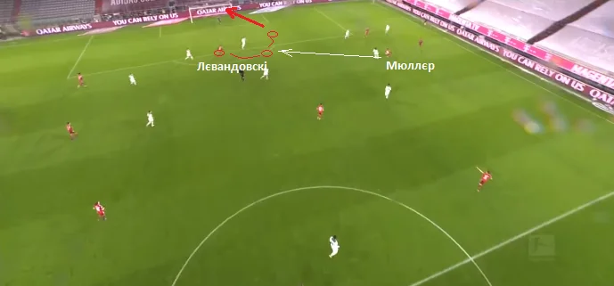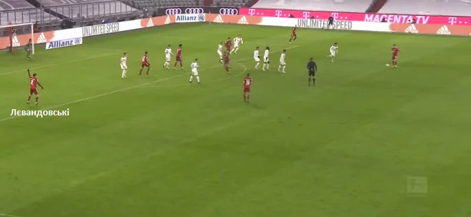 На скріншоті відзначені позиції, звідки стартував Левандовскі, де приймав м'яч і де завершував атаку ударом по воротах. Роберт не перестає вражати. Це просто ідеальний форвард. Він не дав Ельнені ніяких шансів. Відрився в недодачу і першим дотиком ідеально прокинув собі на хід.
