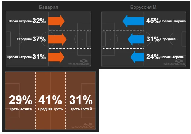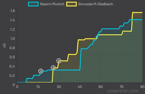 Проте після 25-ї хвилини чемпіони вимкнулися. Склалося враження, що команда підсіла функціонально. На деякий час Баварія взагалі усунулася з гри і гості досить спритно відреагували на проблеми суперника. Гладбах різко увімкнув пресинг та почав притискати опонентів. Саме відрізок з 25 по 31-35 хвилину і став вирішальним у протистоянні. Борусія до перерви могла навіть збільшити свою матеріальну перевагу.