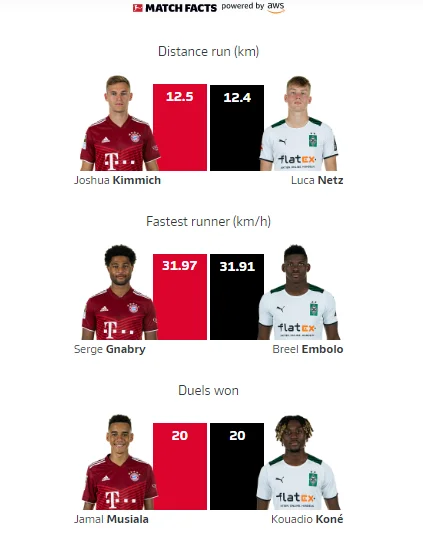 Щодо індивідуальних показників, найбільший пробіг мав Кімміх, найшвидшим гравцем матчу став Гнабрі, лаври найнепоступливішого поділили Мусіала і Коне.