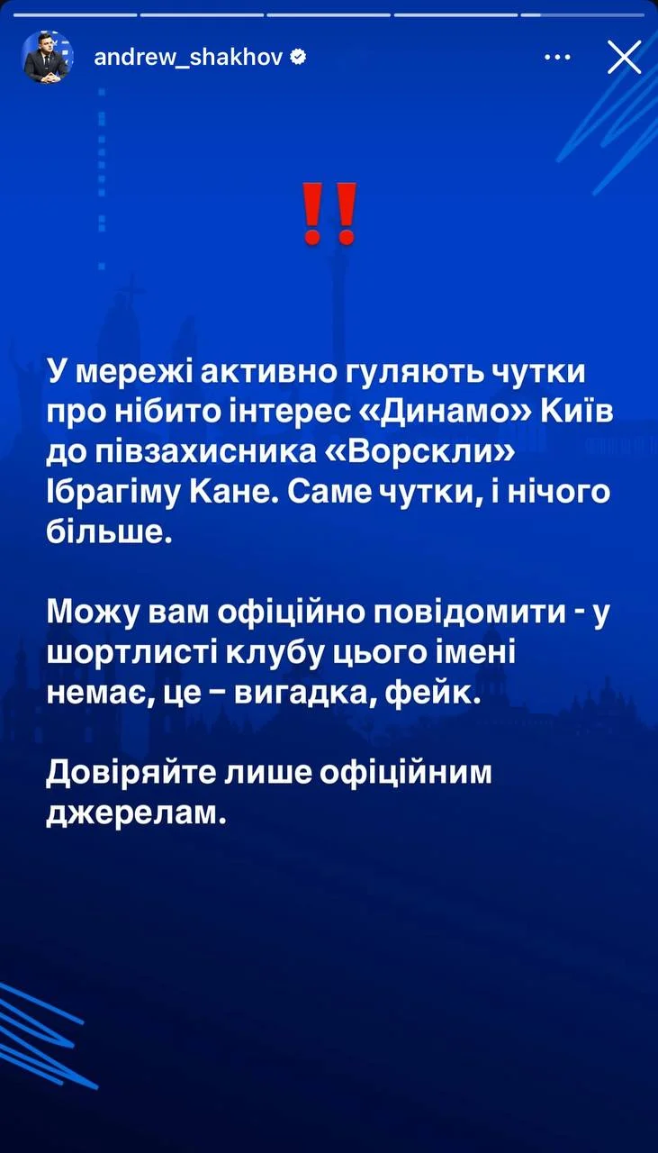 "У мережі активно гуляють чутки про нібито інтерес Динамо Київ до півзахисника Ворскли Ібрахіма Кане. Саме чутки, і нічого більше. Можу вам офіційно повідомити – у шорт-листі клубу цього імені немає, це – вигадка, фейк. Довіряйте лише офіційним джерелам", – написав Шахов на своїй сторінці в Facebook.