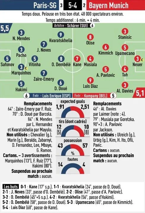 Дії оборони команди Луїса Енріке у протистоянні з підопічними Весана Компані оцінили у 3 бали з 10 можливих. Найвищий бал дістався грузинському вінгеру Хвічі Кварацхелії (9), який оформив дубль у ворота мюнхенців.