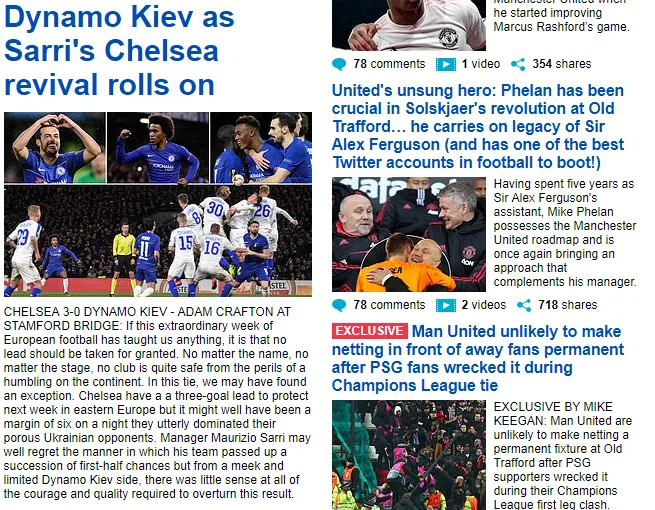 Цей юнак, можливо, отримав вигоду від того, як досвідченіші Педро та Вілліан шматували наївну і панічну оборону киян, але він заслужив на більше шансів. Лише спритність Бойка і марнотратність лондонців могли милувати Динамо від погрому, оскільки цей клуб не показав жодної загрози в атаці та повертався додому, стогнучи. Команда Хацкевича неодмінно створить більше проблем вдома на Олімпійському, але навіть після тижня неймовірних камбеків у єврокубках вона не виглядає здатною повторити щось подібне. Челсі вперше з листопада виграв 3 матчі поспіль і може готуватись до 1/4 фіналу.