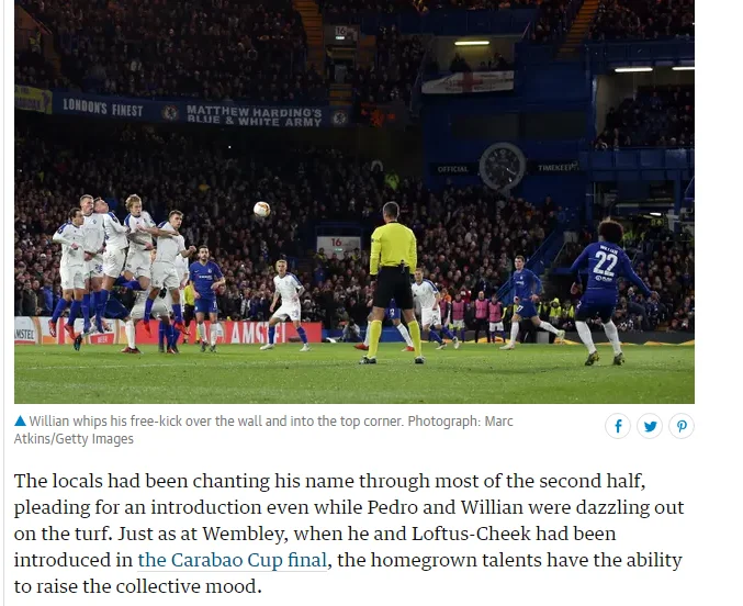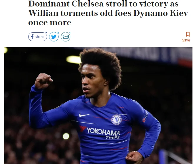"Якщо ви замислюєтеся, чому я не розповів вам про хоч якісь моменти Динамо, це тому, що їх не було", – такими словами на 60-й хвилині коментатор видання оцінив гру киян попереду. Київ запропонував дуже мало в нападі, а в захисті не міг впоратись з темпом і шириною атак господарів. Челсі провів сенсаційний матч, довівши, що кризу кількох матчів подолано. Гру було завершено, а також, безумовно, вирішено і долю протистояння, коли юнак Хадсон-Одой забив третій м'яч у матчі і свій 4-й у сезоні. Фанати "синіх" не можуть зрозуміти, чому він не грає в кожному матчі.