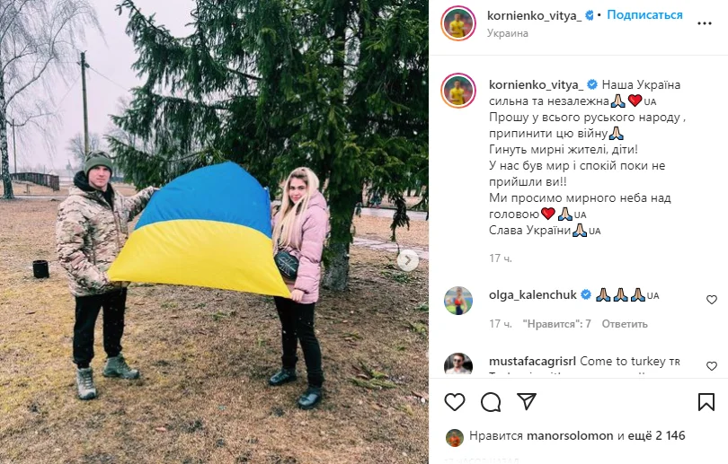 Гинуть мирні жителі, діти! У нас був мир і спокій, поки не прийшли ви! Ми просимо мирного неба над головою. Слава Україні", – написав Корнієнко на своїй сторінці у соціальній мережі Instagram.