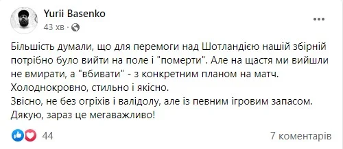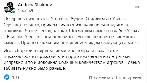 Заступник головреда журналу Футбол Андрій Шахов, попри весь позитив, не поспішає радіти і застерігає: попереду – Уельс, опонент серйозніший від шотландців. Та й сили у першому турі Ліги націй проти Польщі свідомо економились.