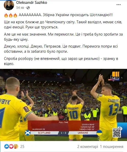 "Футбол 24" зібрав першу реакцію експертів та відомих уболівальників щодо півфіналу за путівку на ЧС-2022 Шотландія – Україна (1:3).