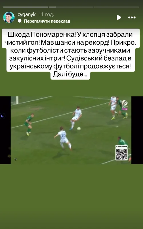 Суддівський безлад в українському футболі продовжується! Далі буде..." – написав Циганик на своїй сторінці у соціальній мережі Instagram.