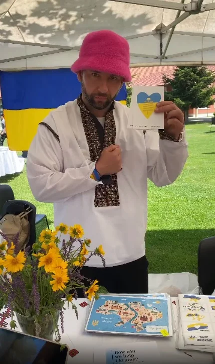 Румун стоїть в одному з наметів на ярмарку і продає наклейки та листівки, присвячені Україні. При цьому 41-річний Разван одягнений у вишиванку та знамениту рожеву панаму, яку носить Олег Псюк – соліст гурту Kalush Orchestra. Атмосферу доповнює хіт Stafania – переможець Євробачення-2022.