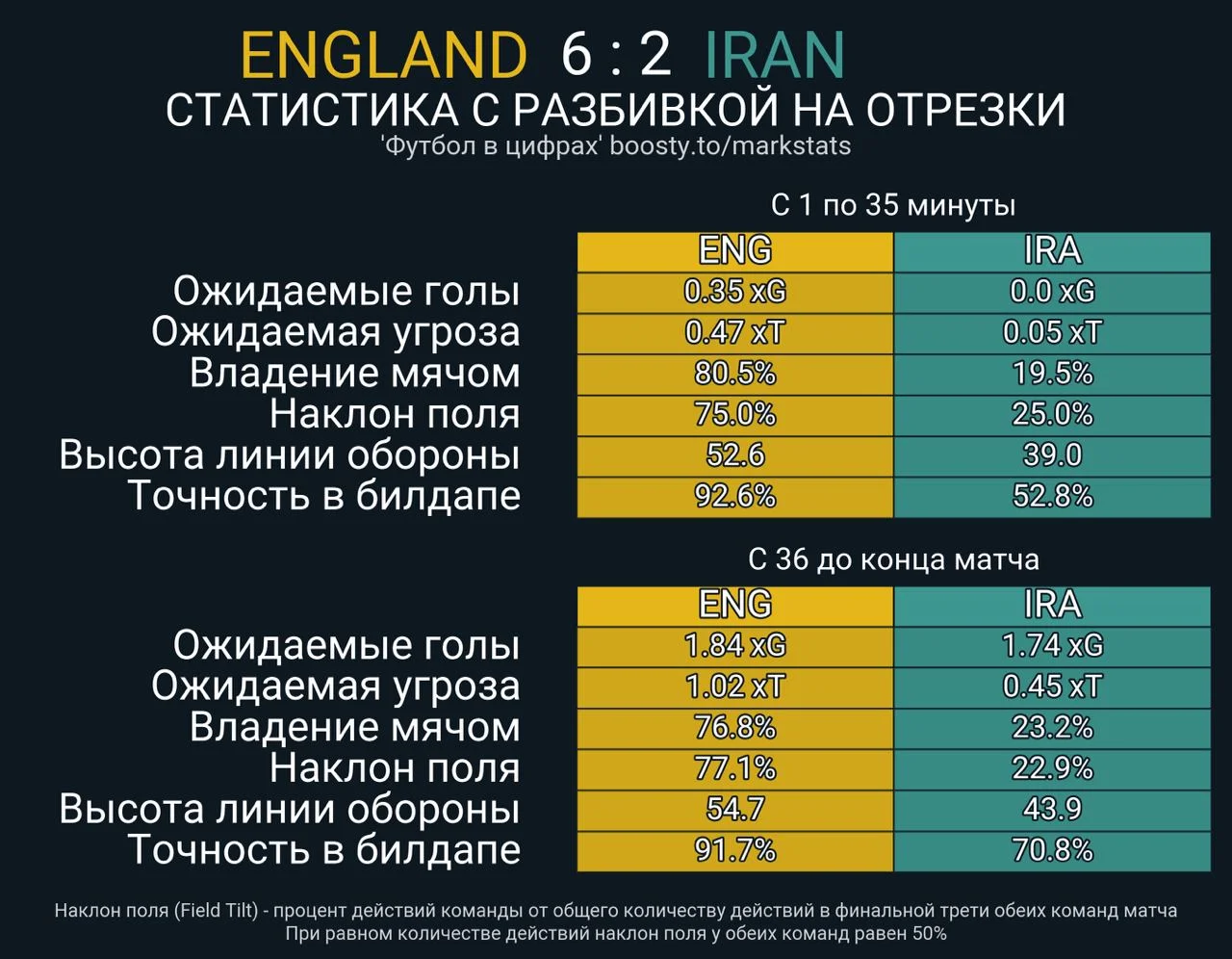 Більшою мірою це пов'язано з особливостями футболу збірної Англії, але факт залишається фактом – Іран тримався. Втім, після того, як табло показало 0:2, Карлуш Кейруш підняв лінію оборони й змусив підопічних інтенсивніше пресингувати. Такий режим гри миттєво завершився ще одним пропущеним м'ячем, а потім ще чотирма – в атаці ж більш агресивна тактика нічим не допомогла.