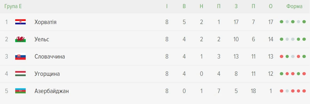 Угорщина з 12 заліковими балами фінішувала аж на четвертому місці квінтету. Третю сходинку посіла Словаччина, яка здолала Азербайджан, але відстала від Уельсу на 1 пункт. Словаків влаштовувала лише нічия в Кардіффі, але суперники не допомогли.