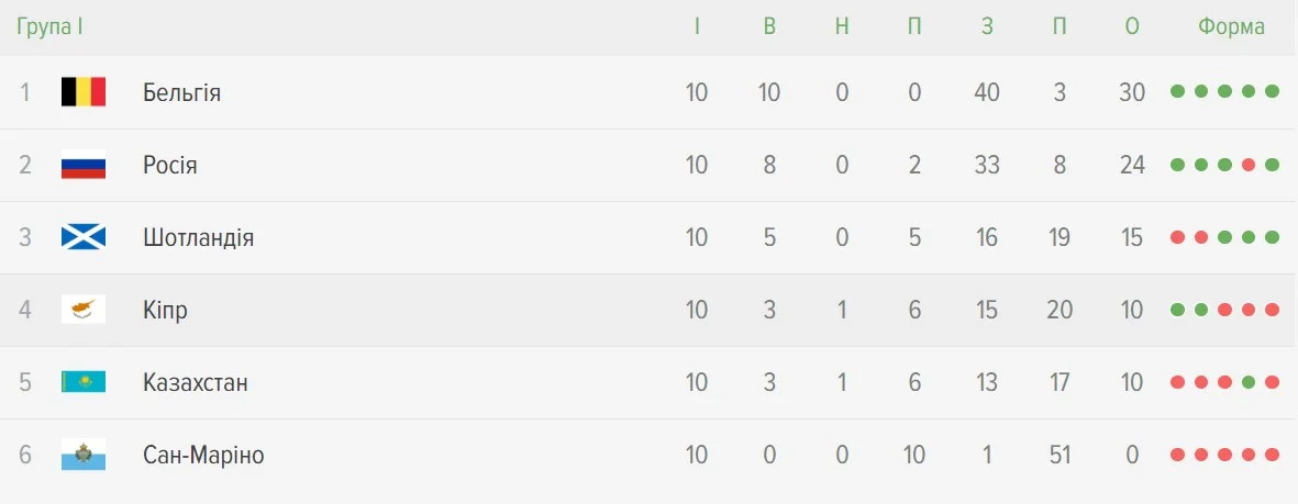 Сьогодні Бельгія розгромила Кіпр. Головним героєм став Кевін де Брюйне: два голи з лінії штрафного майданчика (голкіпер припустився жахливої помилки), асист і три передгольові передачі (якщо рахувати автогол). Росія впоралася з Сан-Маріно, а Шотландія здійснила камбек у поєдинку з Казахстаном і завершила третьою.