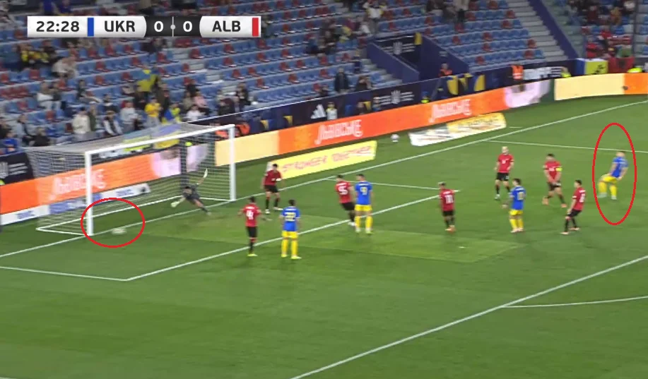 На 23-й хвилині забивати мав Волошин, який прийняв крос від Гуцуляка й без спротиву пробив з близької відстані. Стракоша врятував Албанію, а добивання від Гуцуляка пройшло вже із офсайду. Здавалося, що ось-ось "жовто-сині" відкриють рахунок.
