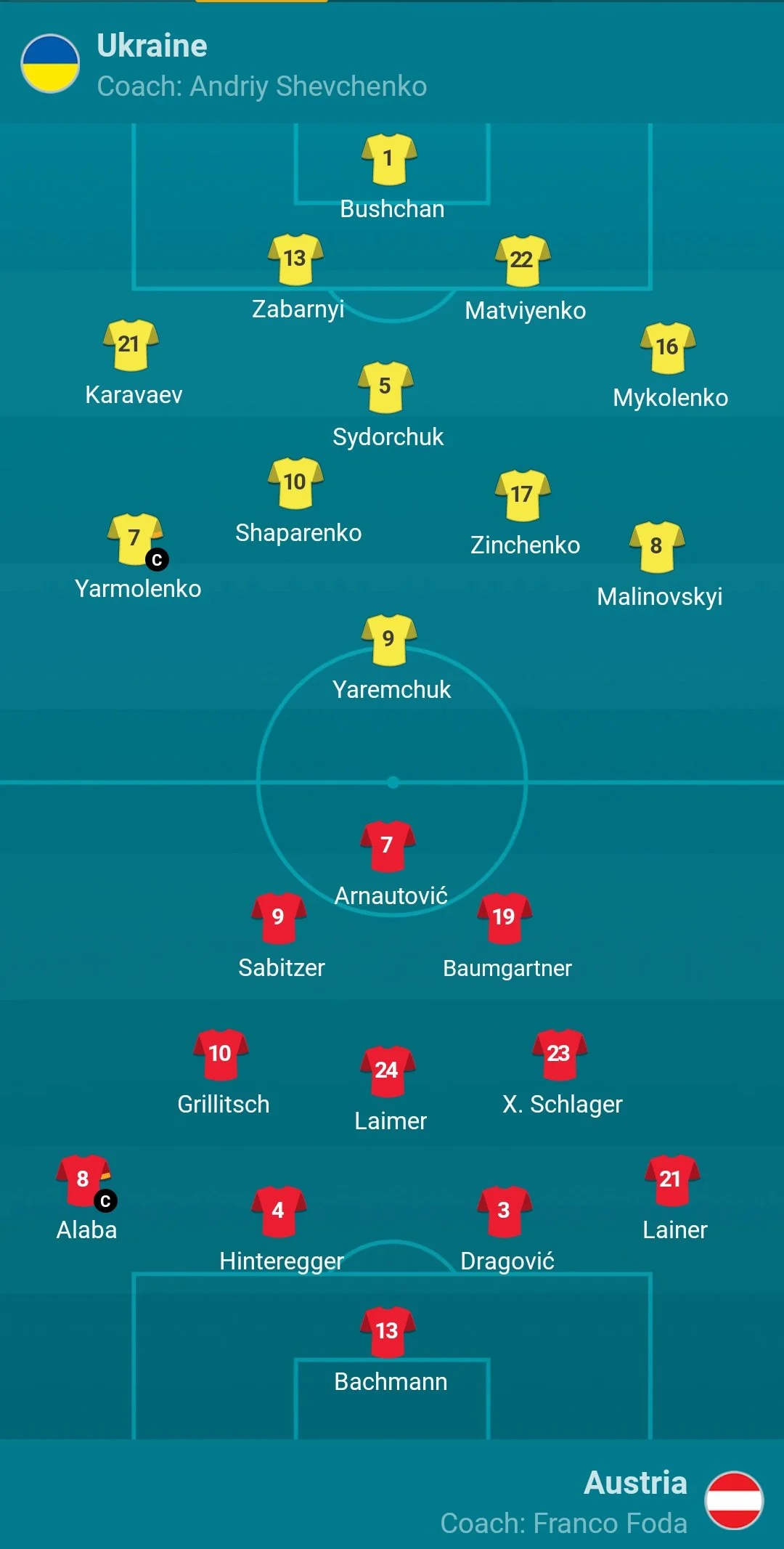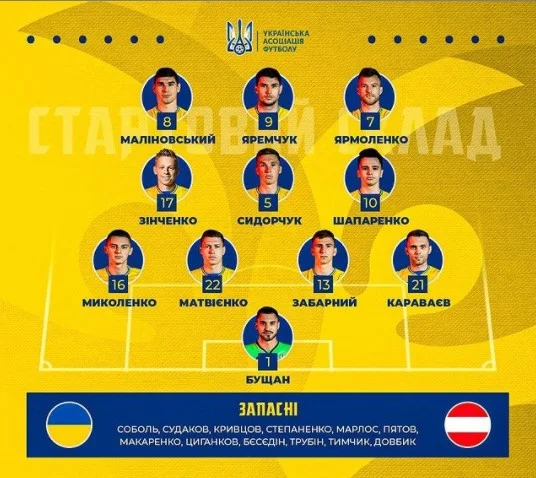 Порівняно з дуеллю проти північних македонців Шевченко зробив лише одну зміну. В опорній зоні Сидорчук, як і у стартовому матчі проти Нідерландів, виходить в основі. Водночас Степаненко повертається в запас. Маліновський знову починає з номінальної позиції лівого вінгера зі звільненням усього флангу для Миколенка. Фода, схоже, кардинально міняє схему. Замість 3-5-2 УЄФА малює 4-3-2-1. Головна зірка збірної Австрії, капітан Давід Алаба, який на Євро-2020 переважно грав у центрі захисту, повертається на фланг. Також замість Ульмера та Грегоріча з перших хвилин виходять Грілліч та Арнаутовіч.