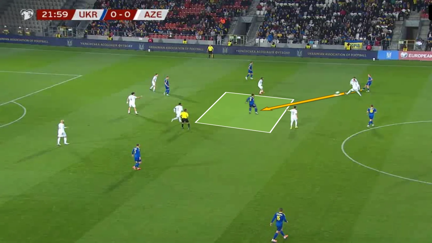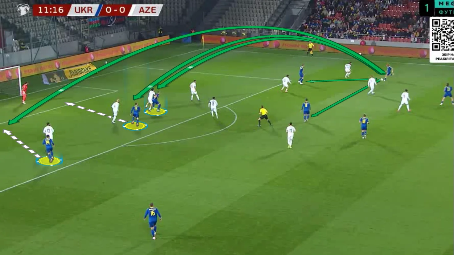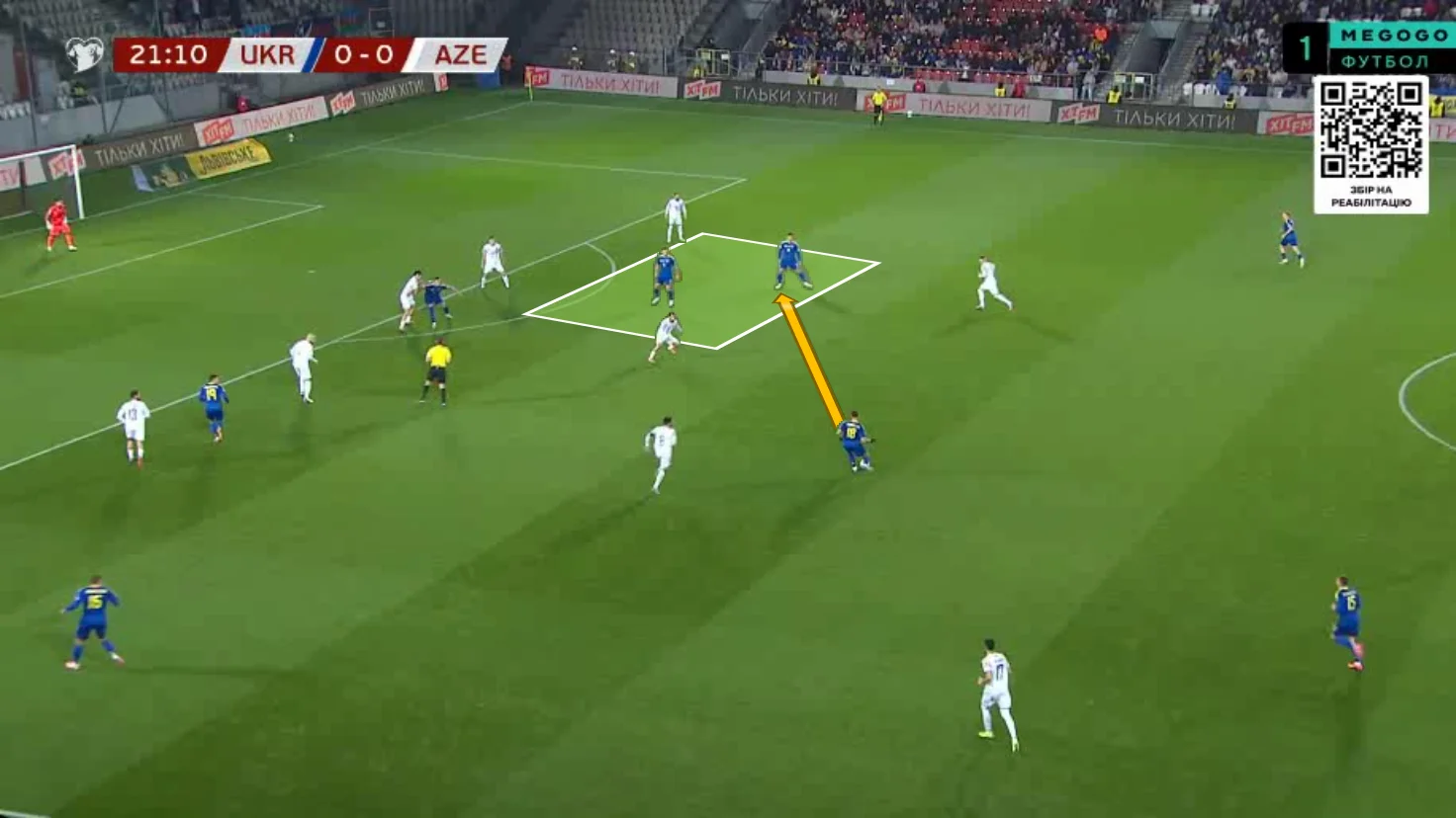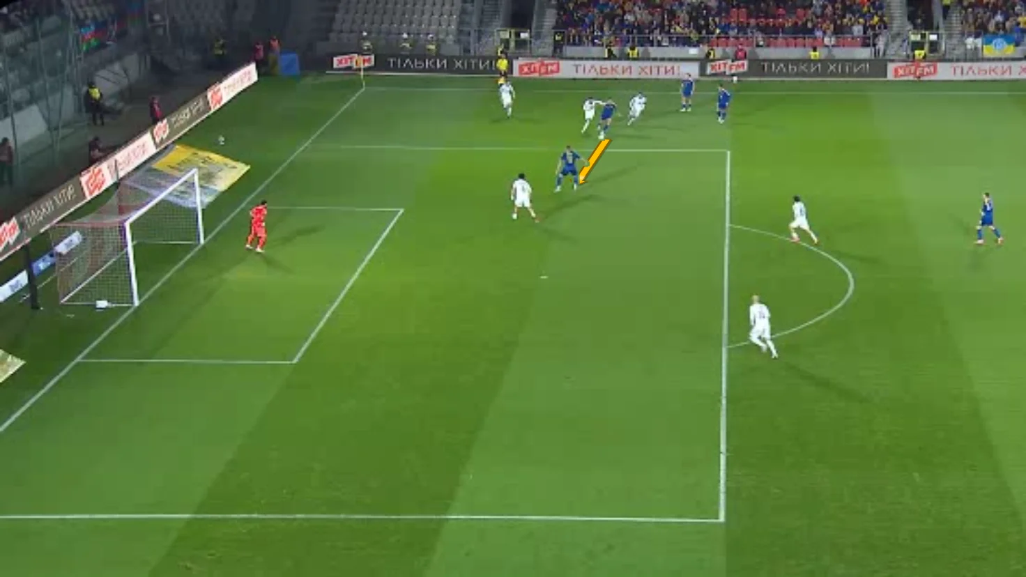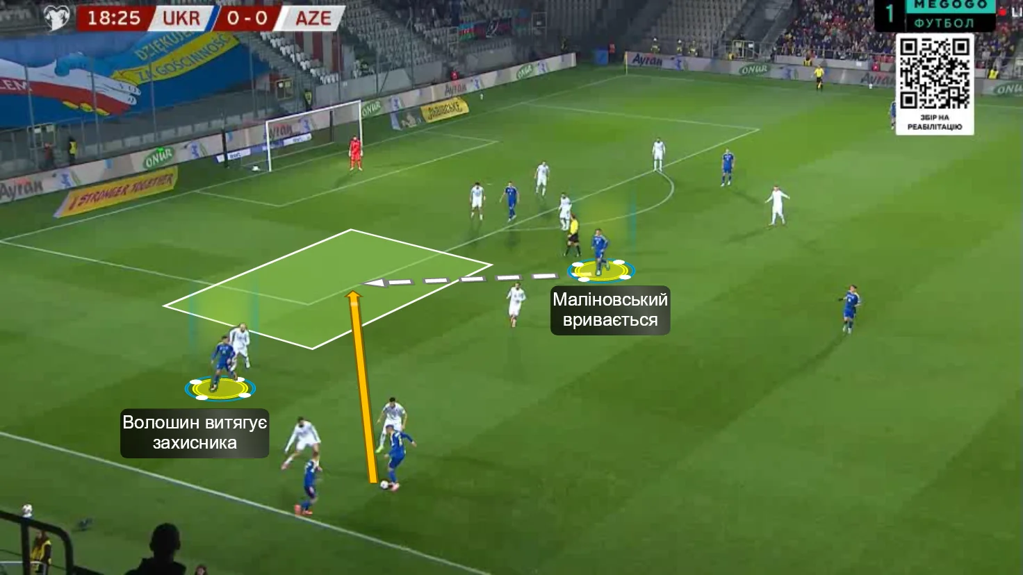 Третій позитив, який явно підгледіли в Ісландії та Франції – спроби перевантажувати останню третину, заходити на чужу половину всім складом і заповнювати простір між лініями. Там спробували виконувати короткі обігрувати 1-в-1 і навіть фінтити – в одному з епізодів Маліновський вийшов з-під тиску "фінтом Зідана". Азербайджанці дуже вразливі під високим темпом руху м'яча й відкривань, а також не люблять нетривіальні рішення суперника.