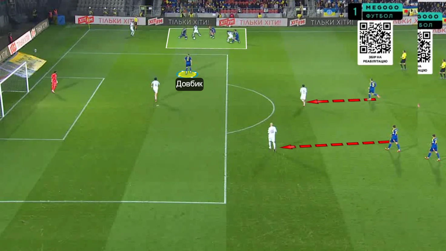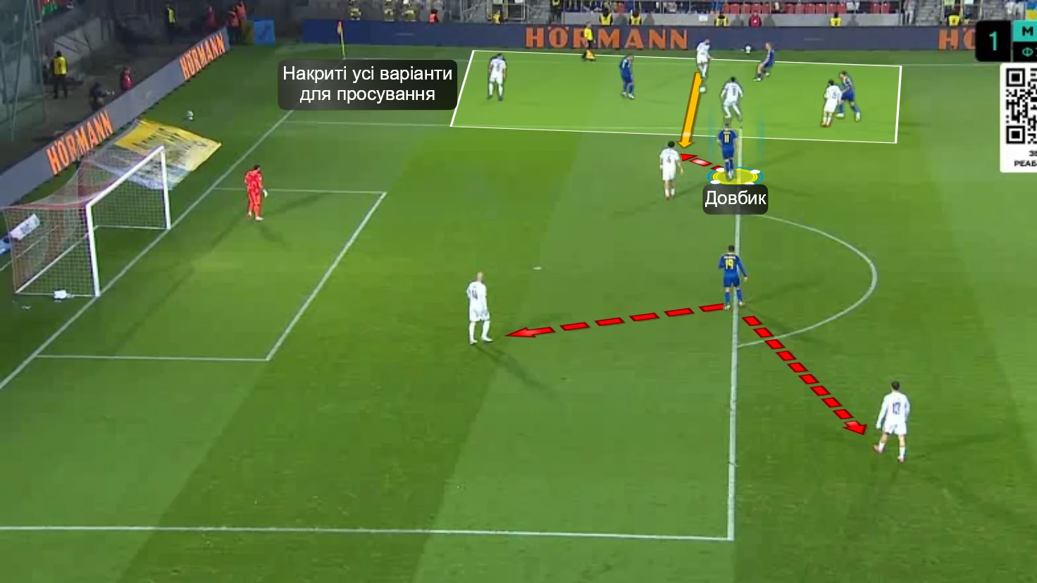 Також здивував високий персональний пресинг, непритаманний збірній України під керівництвом Сергія Реброва. Причому в цій роботі виділявся навіть Довбик, який грамотно розташовувався на лінії передачі голкіперу. Що найбільш важливо, пресинг був дуже ефективним.
