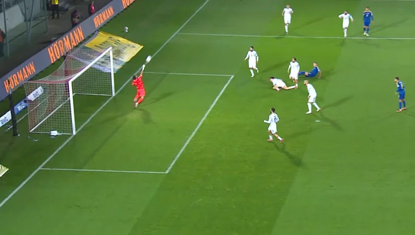 Конопля закинув м'яч на ближню стійку за спини захисникам, а Руслан випередив усіх і пробив з метру в підкаті – Магомадалієв врятував кавказців!