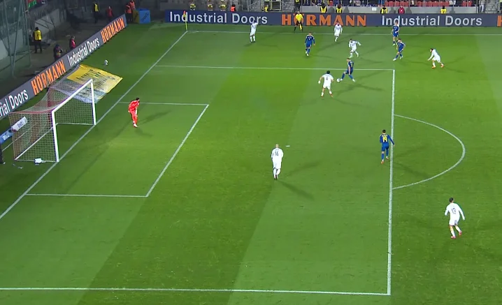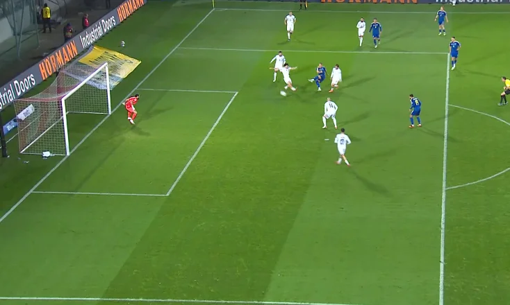 На 38-й хвилині вдалий пресинг українців у штрафному завершився відбиранням Гуцуляка й скидкою на Довбика. Артем виконав несподіваний розворот під удар, вгативши з правого краю у лівий нижній – трохи неточно!