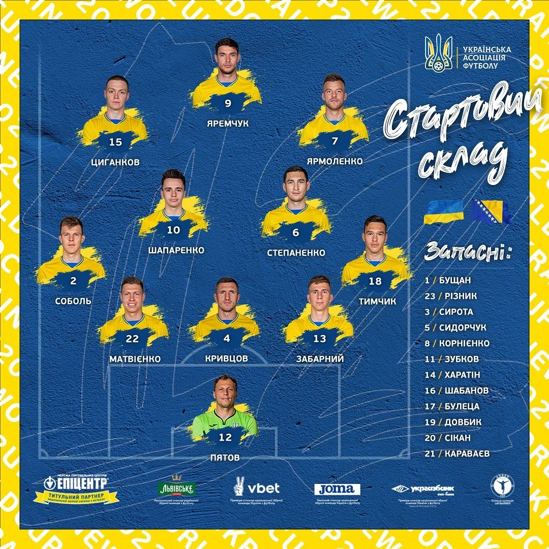 Україна: Пятов – Забарний, Кривцов, Матвієнко – Тимчик, Степаненко, Шапаренко, Соболь – Ярмоленко, Циганков – Яремчук