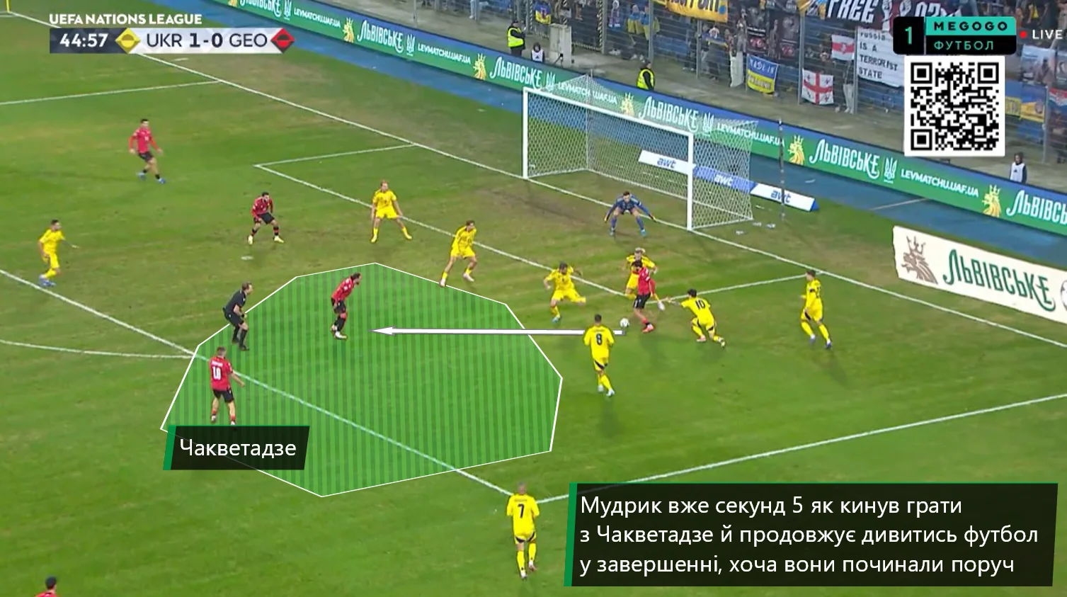Ту ж Грузію не намагались систематично пресингувати перед карним майданчиком, хоча саме в таких епізодах картвелі найбільш вразливі. Також не можна сказати, що потенціал Мудрика розкривався так же, як у Шахтарі – навіть за умов переходу на прагматичний стиль, де вінгери перетворюються у бігунків.