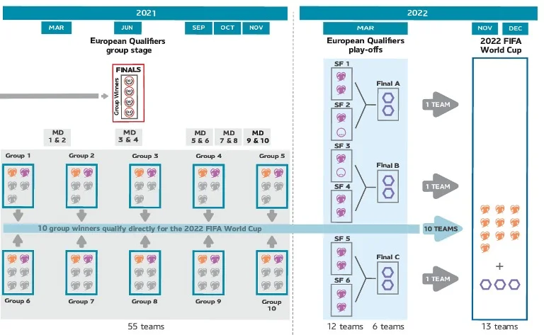 Крім цього, УЄФА визначив процедуру жеребкування відбору Чемпіонату світу 2022. Буде 10 груп (5 кошиків посіву по 10 команд і 6-й, де ще 5), переможці яких виходять на ЧС-2022 напряму, а другі команди розіграють решту путівок у стикових матчах – спочатку 6 півфіналів, а потім 3 фінали. У плей-офф до 10 згаданих команд приєднаються дві найкращі збірні серед переможців груп Ліги націй-2020/2021 (з тих, хто не потрапить до дуету найкращих у групах кваліфікації ЧС-2022).