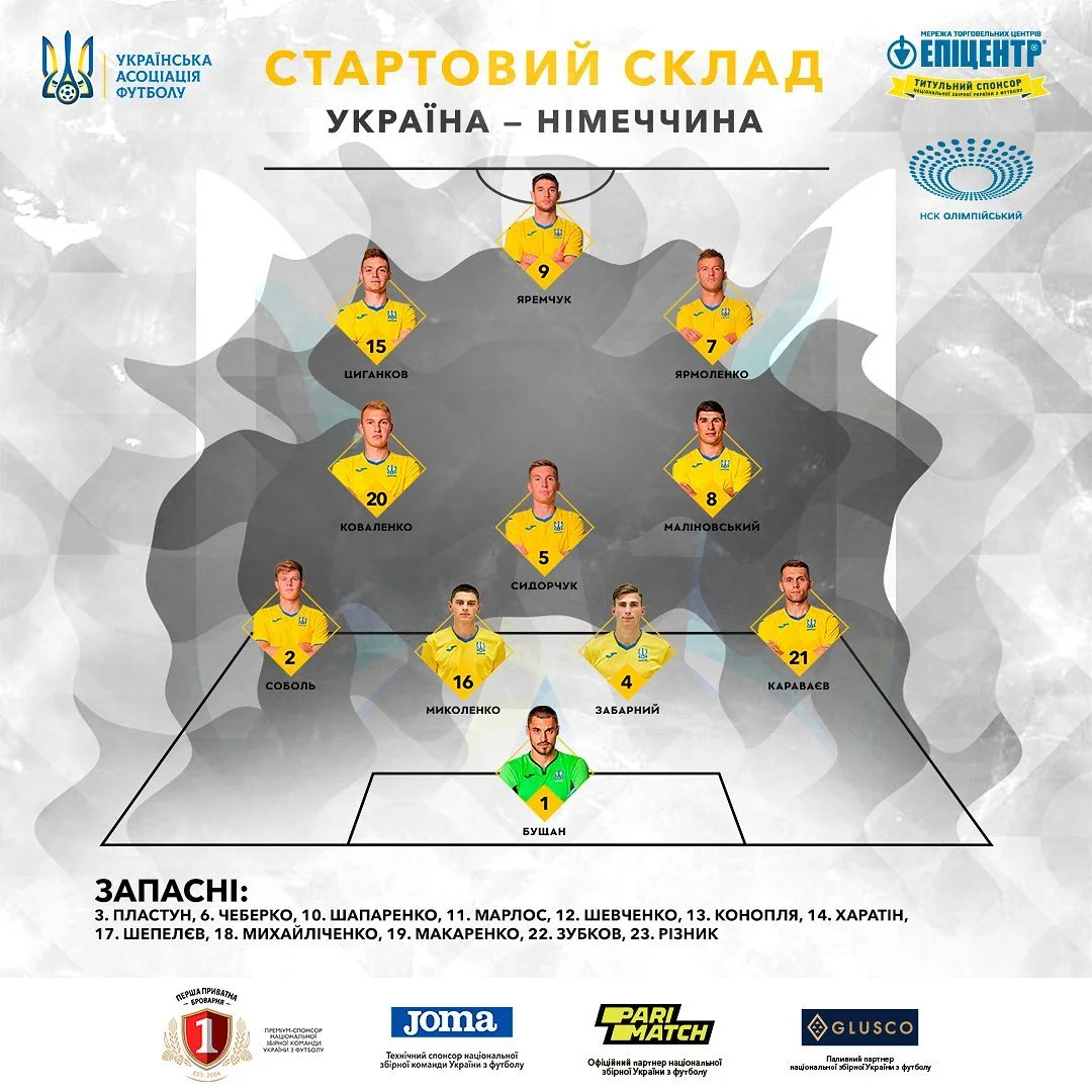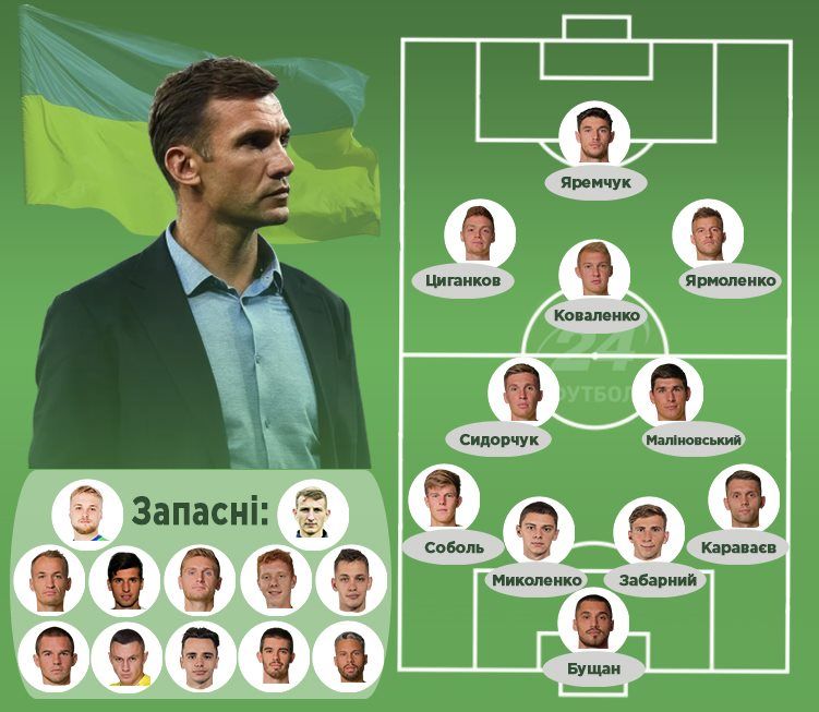 Україна: Бущан – Караваєв, Забарний, Миколенко, Соболь – Сидорчук – Ярмоленко (к), Маліновський, Коваленко, Циганков – Яремчук