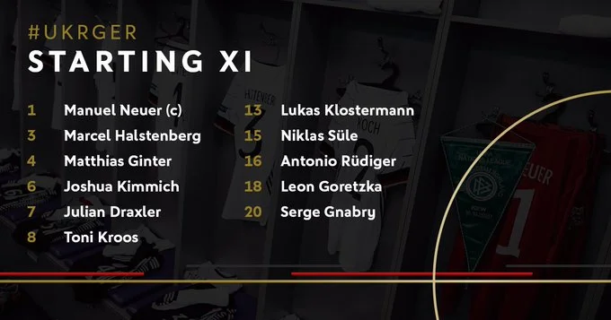 Німеччина: Нойєр – Гінтер, Зюле, Рюдігер – Клостерманн, Кроос, Кімміх, Хальстенберг – Дракслер, Гнабрі, Горецка