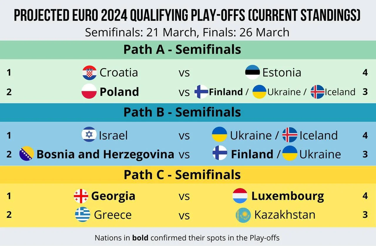 Подію охрестили "матчем року", але цей "матч року" може бути не останнім. У випадку нічиєї чи поразки Україна отримає другий шанс на Євро-2024 – через плей-офф Ліги націй. Можливі суперники наведені на картинці нижче: