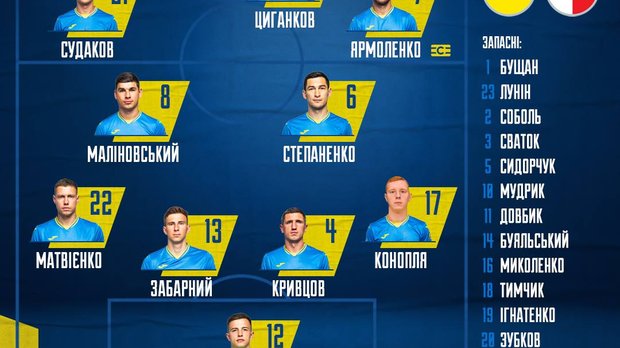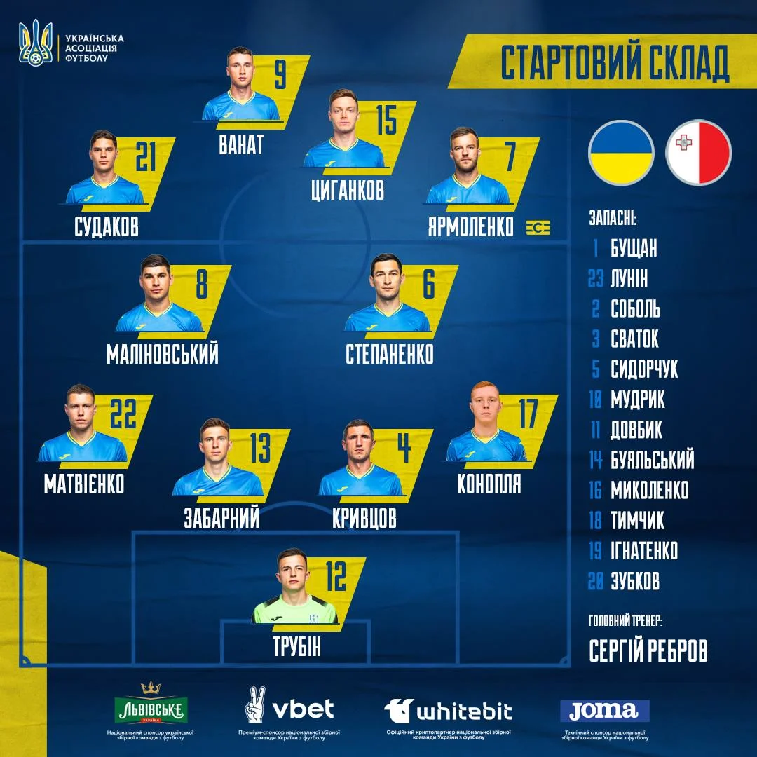 Сергій Ребров, який обіцяв ротацію, зробив 4 перестановки в основі. Ванат, Маліновський, Кривцов і Конопля виходять з перших хвилин. Відповідно Довбик, Мудрик, Тимчик і Миколенко перемістилися на лаву запасних. Ліворуч на фланзі атаки, очевидно, гратиме Судаков, хоча там іноді попередні тренери національної команди використовували й Циганкова. Матвієнко після серії результативних помилок (зокрема, привіз пенальті у матчах проти Німеччини та Північної Македонії) виходить не в центрі оборони, а на фланзі замість Миколенка. Аналогічний дещо експериментальний лівий край ми вже бачили в деяких матчах Шахтаря чемпіонського сезону 2022/23. Ванат дебютує в основі, Маліновський, Кривцов і Конопля такоже вперше при Реброві потрапляють в основу.