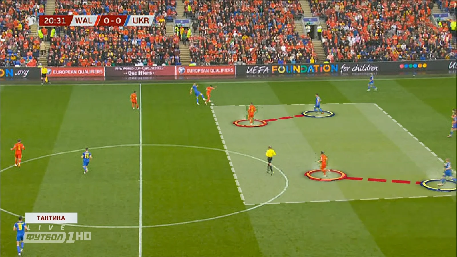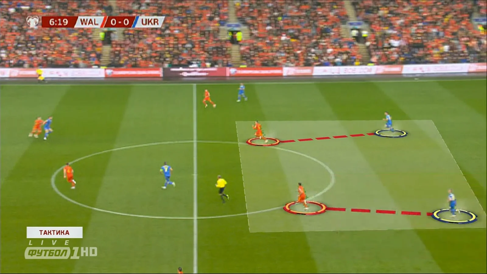 В тактичному плані обійшлося без несподіванок. Україна з перших же хвилин почала встановлювати контроль над м'ячем і розігрувати м'яч в трикутниках.Фулбеки при розіграшах підіймалися високо, Зінченко й Маліновський опускались, Ярмоленко та Циганков відкривалися у напівфланзі, Яремчук підігрував. Велика ставка робилася на контрпресинг і боротьбу за підбирання. Уельс, своєю чергою, відмовився від високого пресингу, обороняючись середнім блоком з перекриванням простору в центрі, а в атаки господарі виходили через лонгболи та ривки по флангах.