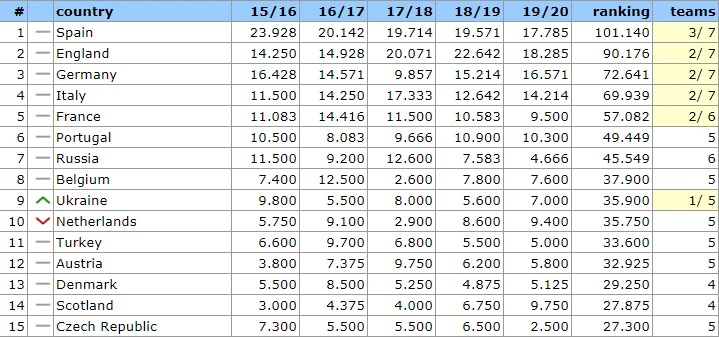 Як наслідок, нашій країні вдалось випередити Нідерланди, чиї клуби більше не беруть участі у поточному розіграші єврокубків і не зможуть обійти Україну.