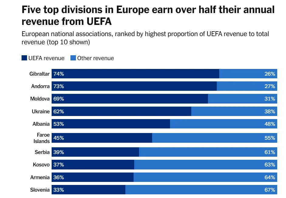 Згідно з даними за 2023-й фінансовий рік, найбільшу частку призові від УЄФА становили в чемпіонаті Гібралтару – 74%. Далі йде Андорра (73%), Молдова (69%), Україна (62%) та Албанія (53%).