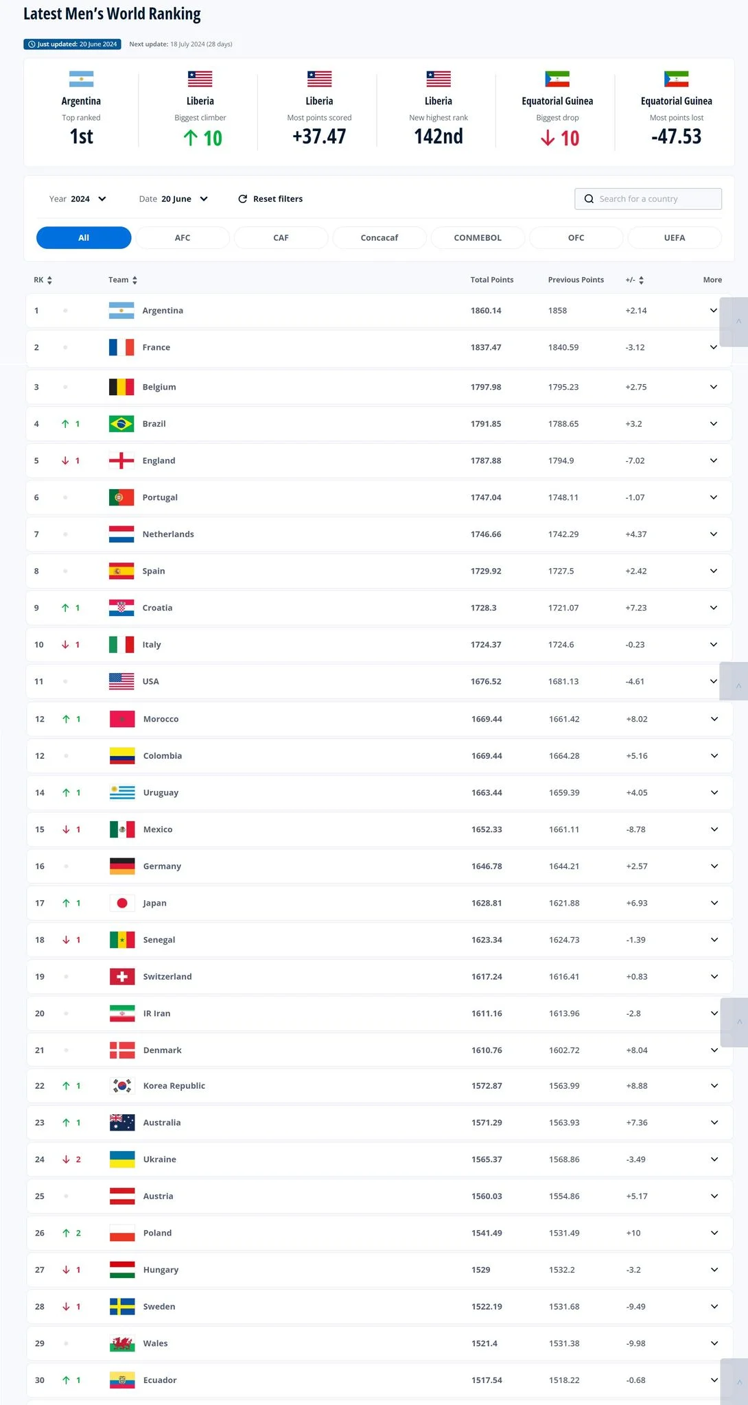 У топ-10 відбулися лише дві зміни – Хорватія випередила Італію, а Бразилія обійшла Англію. Очолює рейтинг Аргентина, на другому місці Франція, а Бельгія, з якою українцям грати на Євро-2024, розташувалася на третій сходинці.