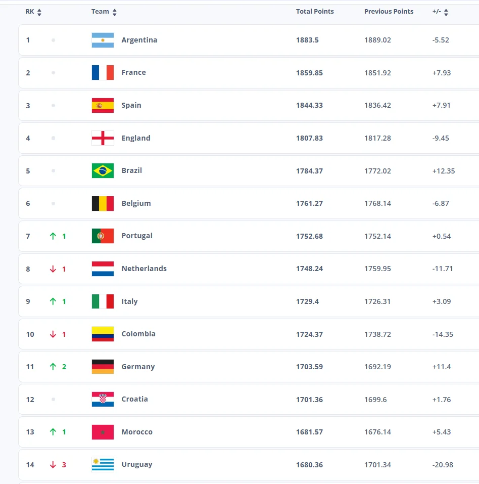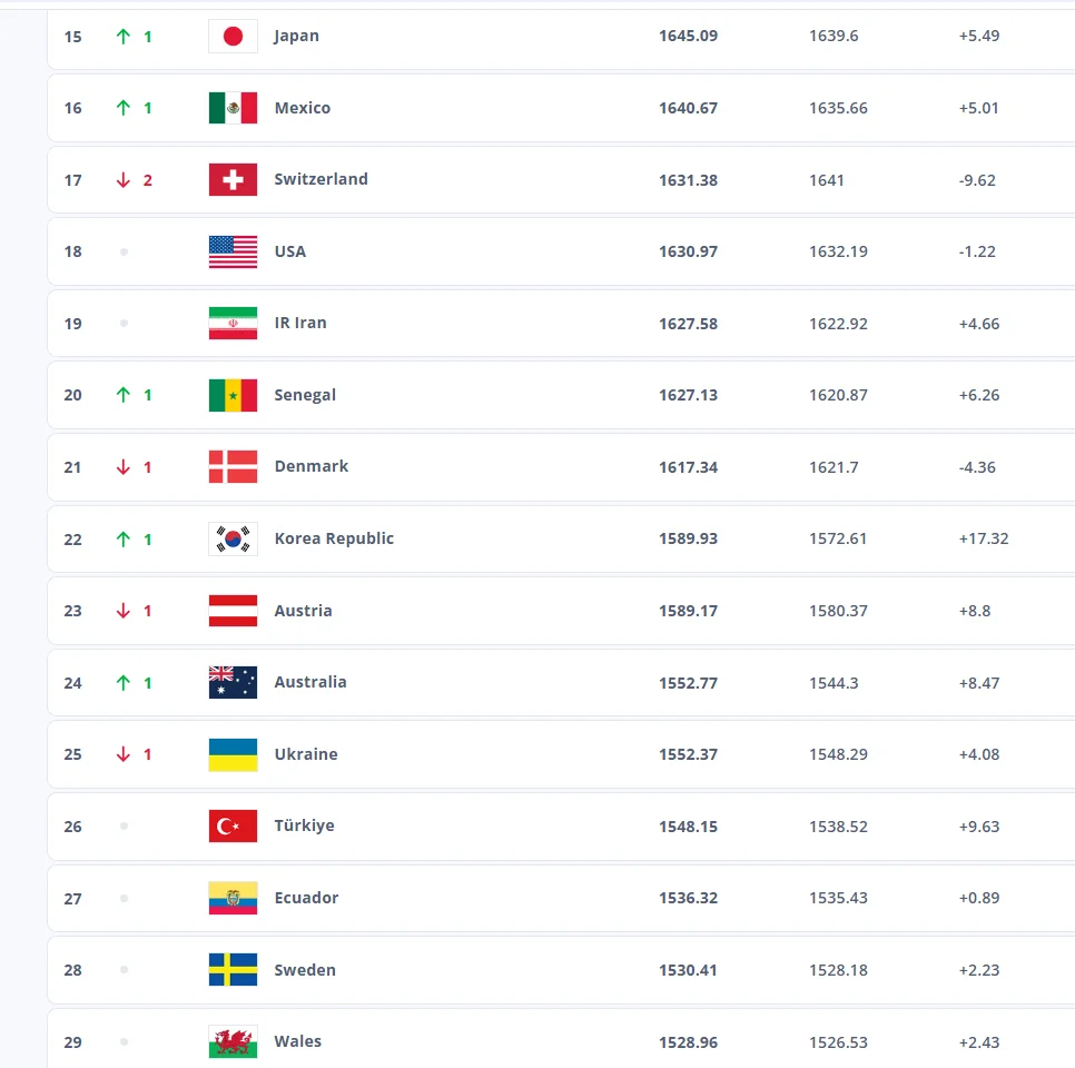 Суперники України у групі В1 Ліги націй посідають наступні місця: Чехія – 45-та (+1 сходинка), Албанія – 65-та (+2), Грузія – 67-ма (-1). До слова, продовжує лідирувати у рейтингу Аргентина, далі розташувались Франція та Іспанія.