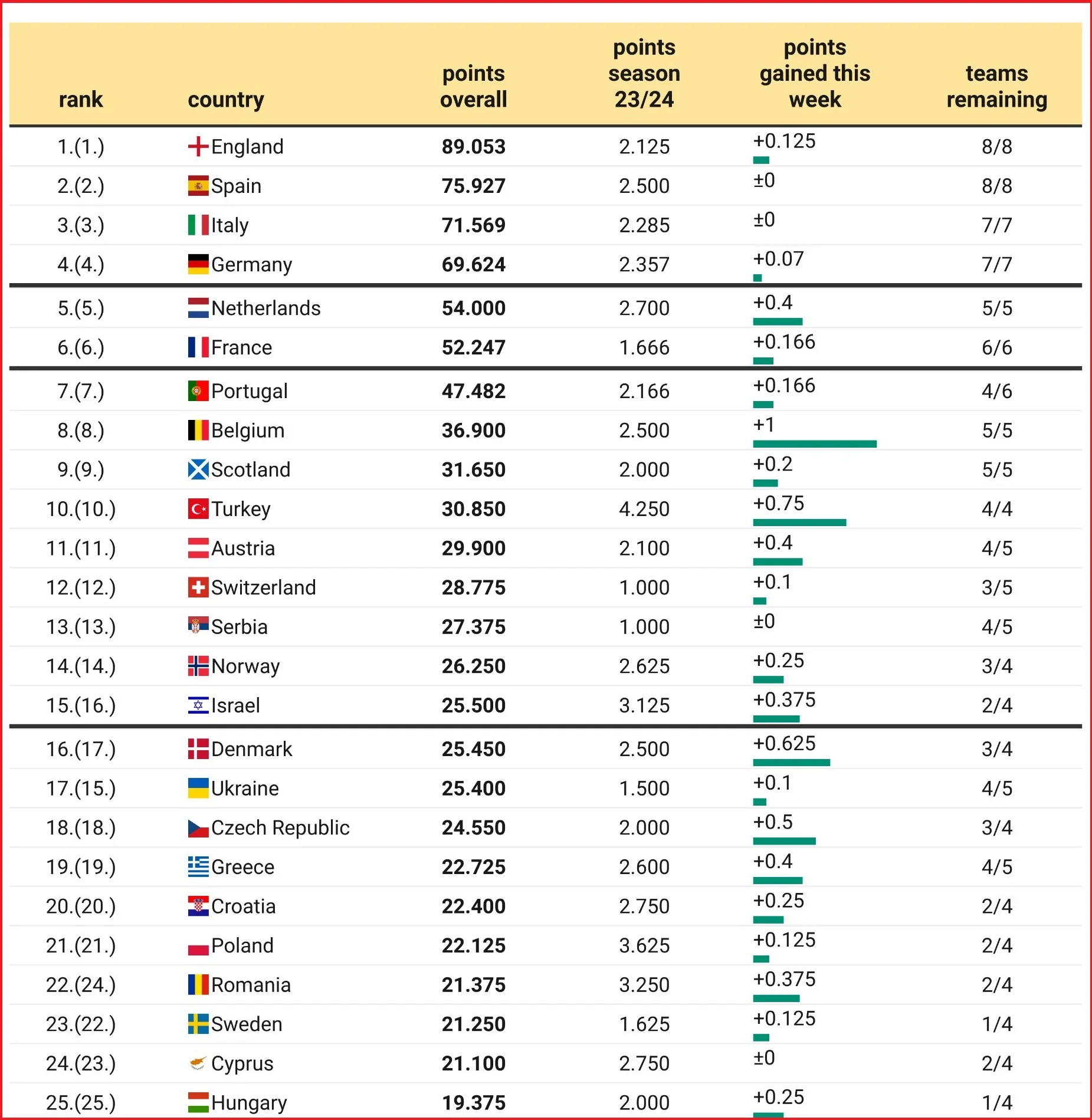 У сезонному рейтингу Україна аж на 36 місці. Очолює його Туреччина, яка намагається протягнути в групові етапи всі 4 команди.