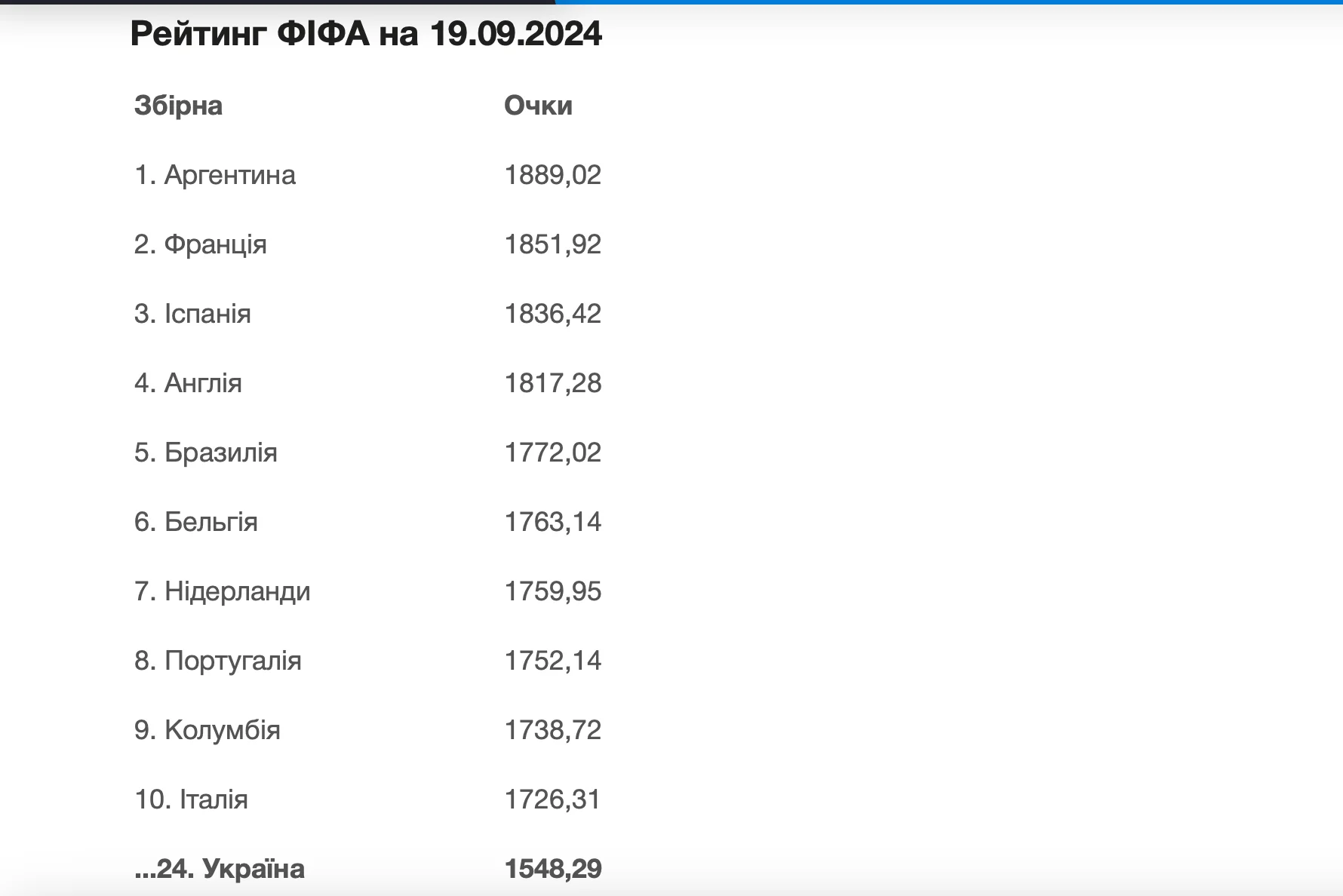 ФІФА оприлюднила новий рейтинг національних збірних, у якому збірна України піднялася на одну сходинку та тепер посідає 24-е місце. Це сталося навіть попри поразки в останніх матчах Ліги націй від Албанії (1:2) та Чехії (2:3).